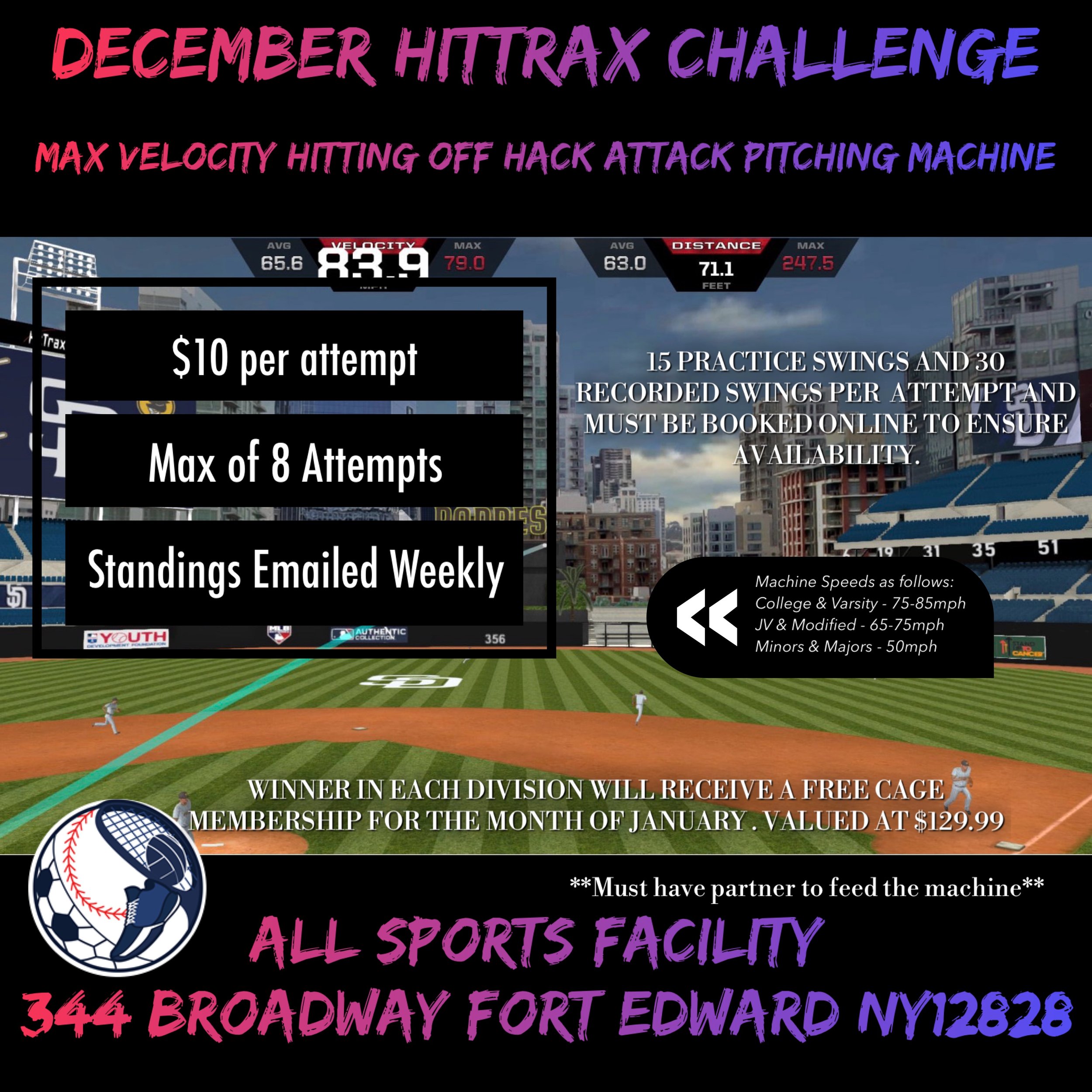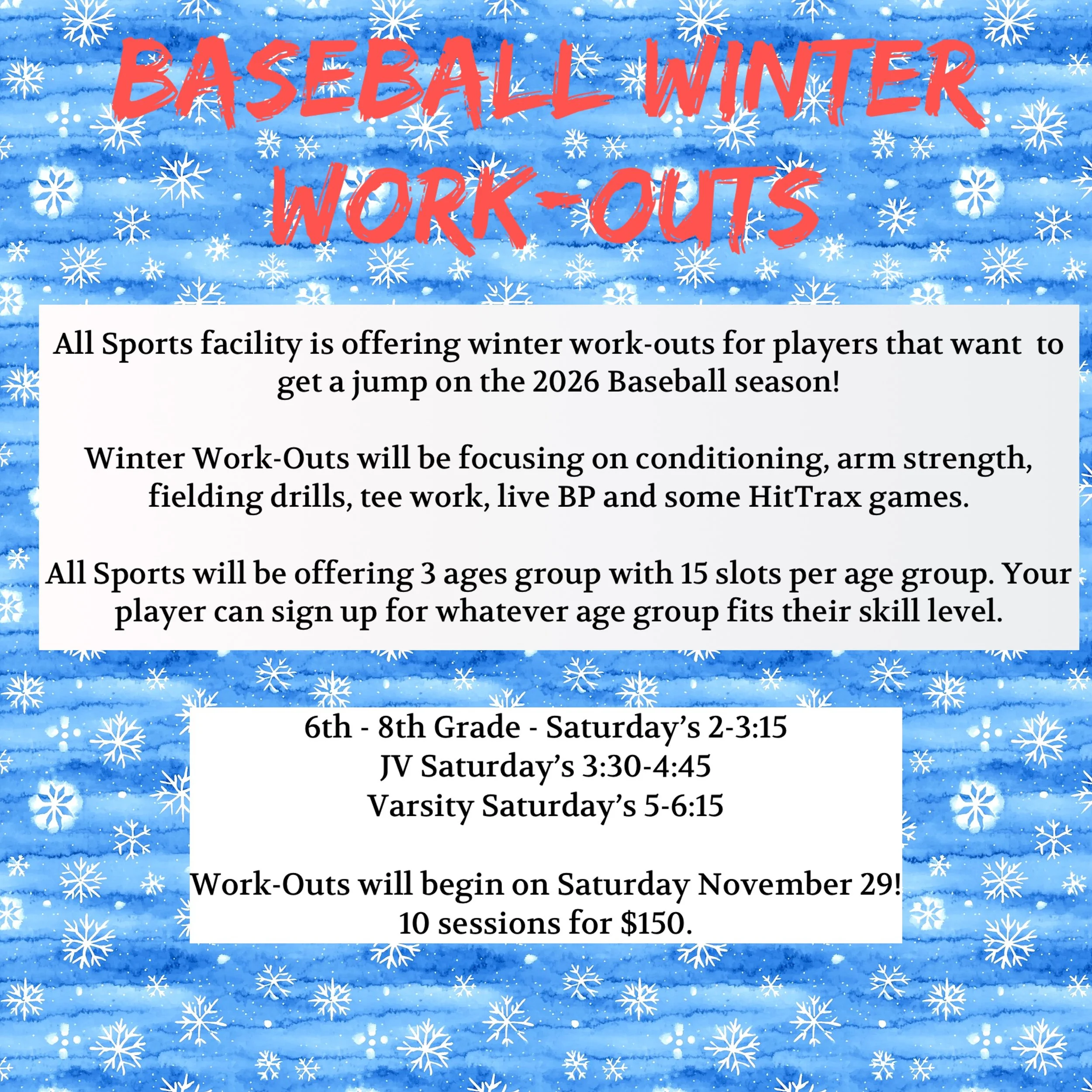 Begin your 2026 Baseball Season with winter workouts that will emphasize conditioning, arm strength, fielding drills, tee work, live batting practice, and HitTrax games.