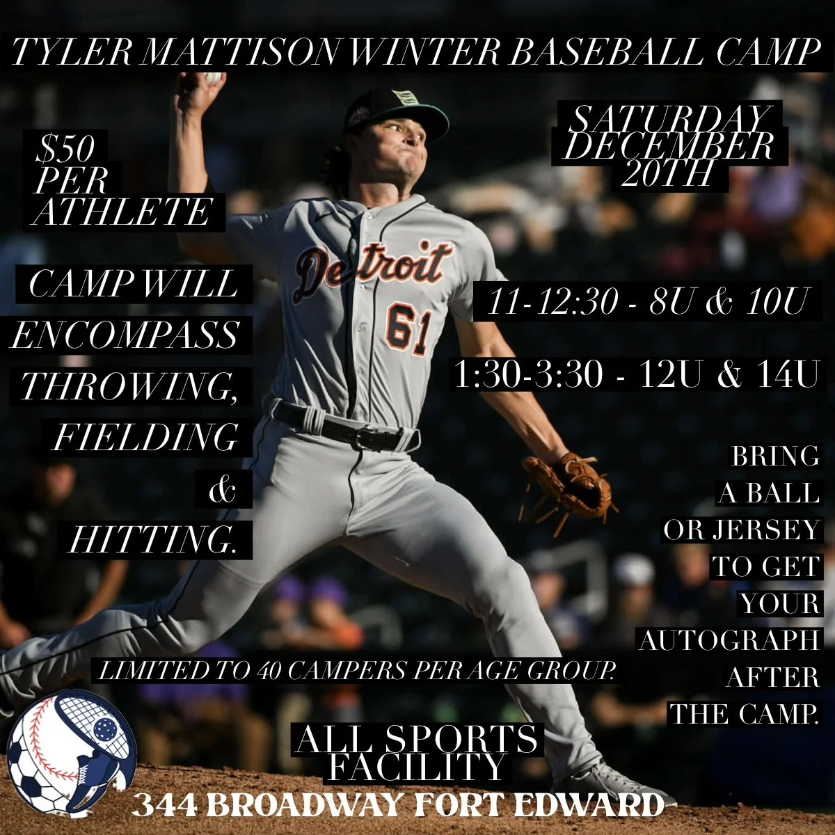 Get ready for an unforgettable experience! 🎉 The hometown kid is back and hosting an exclusive baseball clinic here at the All Sports Facility!! 🏟️ This comprehensive camp will encompass three action-packed stations, focusing on throwing, fielding, and hitting techniques. 🏃♂️ Our expert coaches will provide personalized guidance and tips to help you improve your skills. 📈 Bring a ball or jersey for the autograph session immediately following each training session, and don't miss this unique opportunity to meet the hometown hero! 🤝 The last autograph session will be open to the public from 3:30-4, so mark your calendars and spread the word! 📅 Don't miss out on this fantastic chance to learn from the best and take home an unforgettable memory! 🎁